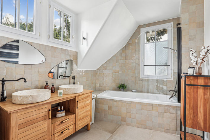 Rénovation des étages d'une maison meulière : pièces d'eau et chambres.